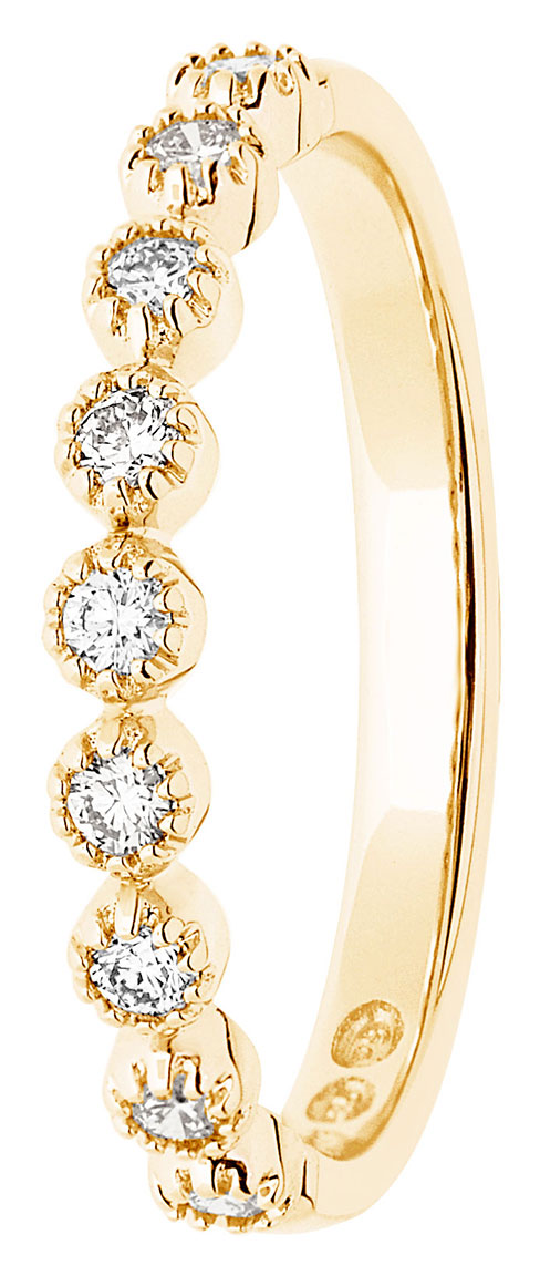 Festive Anna 559-018-kk är en vacker diamantring av gulguld med stenar på rad. Största delen av ringstorleken tillverkas på beställning, och då är leveranstiden 10-20 arbetsdagar. Diamantringar som beställs från fabriken har endast bytesrätt. Graverade diamantringar har ingen retur- eller bytesrätt. Mer information om ringen hittar ni nedan på Mer information -fältet.