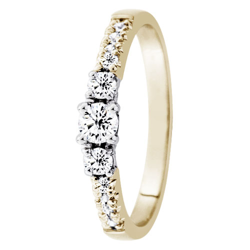 Festive Aurora 505-033-kk är en vacker diamantring av gulguld med sidostenar. Största delen av ringstorleken tillverkas på beställning, och då är leveranstiden 10-20 arbetsdagar. Diamantringar som beställs från fabriken har endast bytesrätt. Graverade diamantringar har ingen retur- eller bytesrätt. Mer information om ringen hittar ni nedan på Mer information -fältet.
