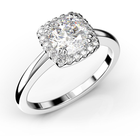 Festive Elsa 587-090-VK med en 1,00 ct cushionslipad mittsten och 20 0,005 ct stenar runtom sig.