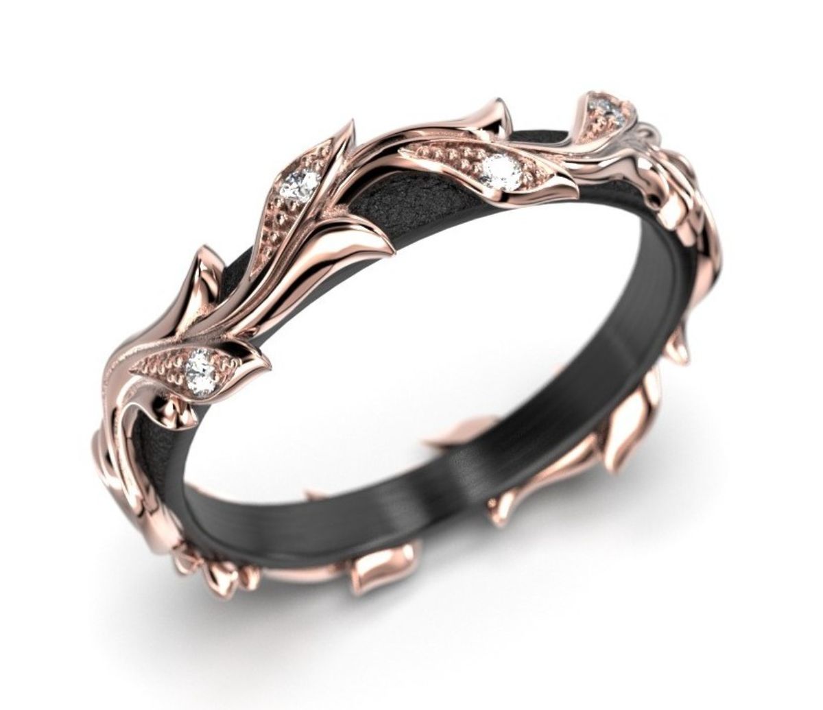 Den Festive Feeniks diamantringen 702-008-PK är infattad med åtta Wesselton SI1-diamanter, (8 x 0,01) eller ditt val av åtta Top Wesselton VS1 labbodlade diamanter, som väger totalt 0,08 ct. Den här filigranringen i svart zirkonium och guld är en hyllning till naturen och dess förmåga till förnyelse. Diamantringen i roséguld tillverkas i valfritt 14 eller 18 karats guld. Ringens bredd är 3,2 mm.