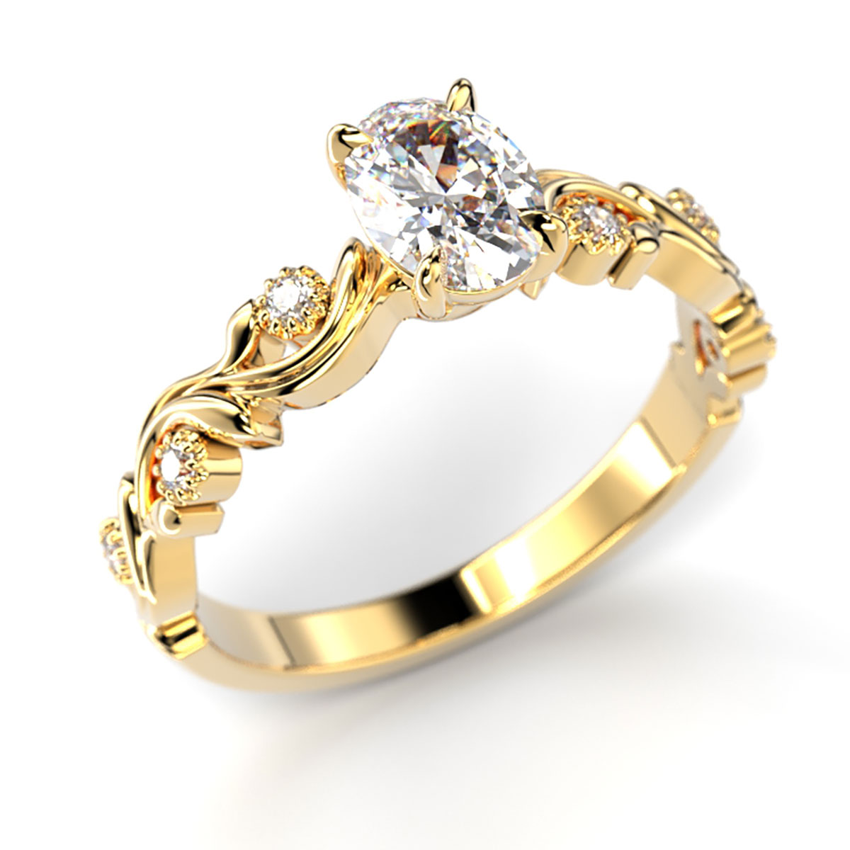 Den imponerande Feeniks Lux Oval diamantringen pryds av en 0,50 karats oval slipad diamant. Ringen, tillverkad av 14 karat vitguld, är inspirerad av naturen och dekorerad med en klättermönstring och sex mindre diamanter. Diamanterna finns både som naturliga och laboratoriediamanter. Diamanternas färg är Wesselton och renhetsgrad VS1. Feenix Lux Oval-ringen finns också i vit och rödguld