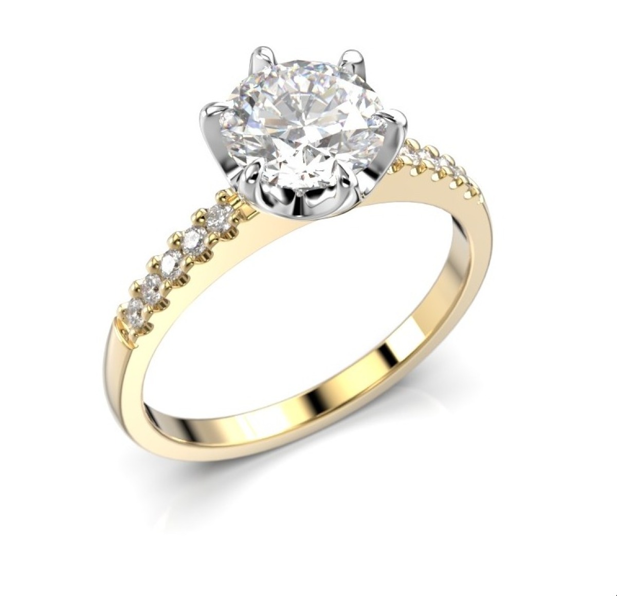 Festive Julianna sidostens diamantring 1,10 ct krona gultvitguld 682-110-KV består av cirka 10 stycken diamanter om 0.010 carat, samt 1 diamant om 1,00 carat. Total caratvikt cirka 1,10 ct. Klo på denna sidostensring är i vittguld för modern touch.