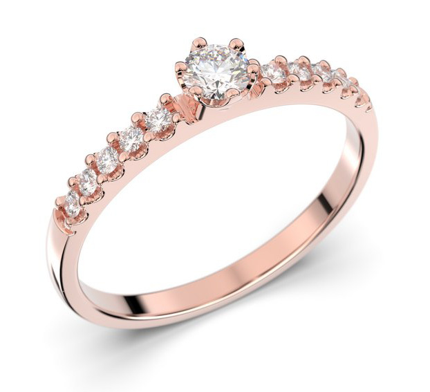 Festive Julie 608-022-PK är en lyxig sidostensring med en rad av 10 små 0,01 ct diamanter i skenan på vardera sida av 0,12 ct centerstenen. Tjocklek 1,9 mm.