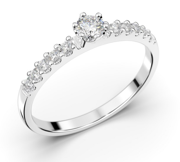 Festive Julie 608-022-VK är en lyxig sidostensring med en rad av 10 små 0,01 ct diamanter i skenan på vardera sida av 0,12 ct centerstenen. Tjocklek 1,9 mm.