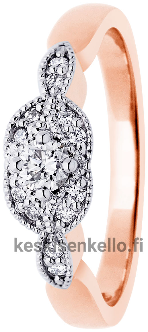 Festive Lavender 526-027-pk är en vacker halo diamantring av rödguld. Största delen av ringstorleken tillverkas på beställning, och då är leveranstiden 10-20 arbetsdagar. Diamantringar som beställs från fabriken har endast bytesrätt. Graverade diamantringar har ingen retur- eller bytesrätt. Mer information om ringen hittar ni nedan på Mer information -fältet.