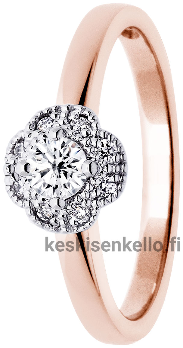 Festive Linnea 525-030-pk är en vacker halo diamantring av rödguld. Största delen av ringstorleken tillverkas på beställning, och då är leveranstiden 10-20 arbetsdagar. Diamantringar som beställs från fabriken har endast bytesrätt. Graverade diamantringar har ingen retur- eller bytesrätt. Mer information om ringen hittar ni nedan på Mer information -fältet.