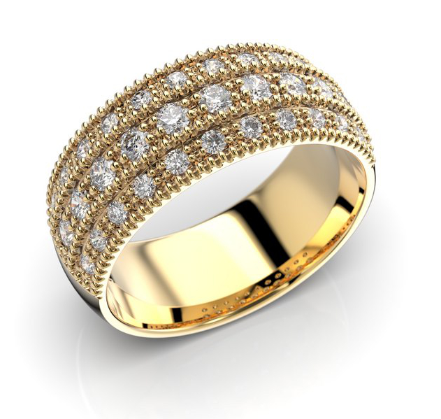 Festive Manuela 579-052-KK trippel allians diamantring i gulguld med 10 0,03 ct och 22 0,01 ct diamanter. Bredd 7,7 mm. Största delen av ringstorleken tillverkas mot order, och då är leveranstiden 10-20 arbetsdagar. Diamantringar som beställs från fabriken har endast bytesrätt. Graverade diamantringar har ingen retur- eller bytesrätt. Mer information om ringen hittar ni på Mer information -fältet.