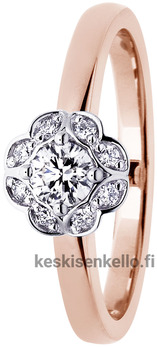 Festive Mimosa 529-030-pk är en vacker halo diamantring av rödguld. Största delen av ringstorleken tillverkas på beställning, och då är leveranstiden 10-20 arbetsdagar. Diamantringar som beställs från fabriken har endast bytesrätt. Graverade diamantringar har ingen retur- eller bytesrätt. Mer information om ringen hittar ni nedan på Mer information -fältet.