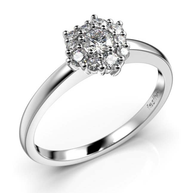 Festive Nadja Halo vitguld diamantring 690-028-VK är en tidlös klassiker med 11 st diamanter (0,10 + 4 x 0,03 + 6 x 0,01) i en haloinfattning med en blommig känsla. Bredden på ringens skena är 1,8 mm, och 7,5 mm vid infattningen. Ringen är i vitguld och ni kan välja om ni önskar ringen i 18 karat guld eller 14 karat.