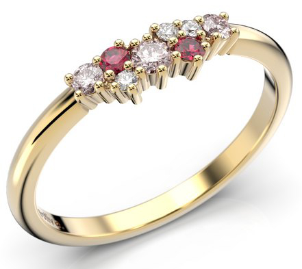 Festive Nadja Pink diamant carmosering 650-018P-KK är en tidlös klassiker med 3 x 0,01 ct diamater, pink rubiner 0,05 + 2 x 0,02 ct och turmaliner 2 x 0,03 ct som sitter utplacerade längsmed bandet. Bredd 1,8 mm. Största delen av ringstorleken tillverkas mot order, och då är leveranstiden 10-20 arbetsdagar. Diamantringar som beställs från fabriken har endast bytesrätt. Mer information om ringen hittar ni på Mer information -fältet.