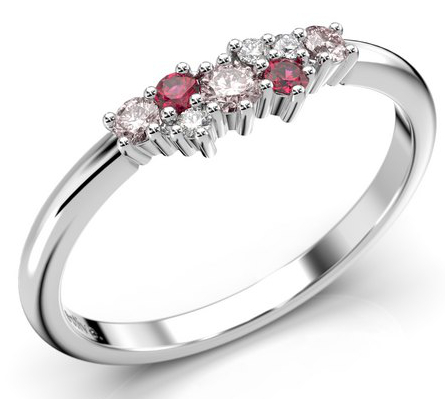Festive Nadja Pink diamant carmosering 650-018P-VK är en tidlös klassiker med 3 x 0,01 ct diamater, pink rubiner 0,05 + 2 x 0,02 ct och turmaliner 2 x 0,03 ct som sitter utplacerade längsmed bandet. Bredd 1,8 mm. Största delen av ringstorleken tillverkas mot order, och då är leveranstiden 10-20 arbetsdagar. Diamantringar som beställs från fabriken har endast bytesrätt. Mer information om ringen hittar ni på Mer information -fältet.