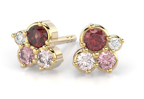 Ett par Festive Nelly Pink diamant carmose örhängen 629-024P-KK dekorerad med diamanter (2 x 0,01 ct), rubiner (2 x 0,05 ct), ljusröda safirer (2 x 0,03 ct) och tourmaliner (2 x 0,03 ct). Diameter 5,5 mm. Bär ensam eller kombinera med Nelly-halsband. Mer information om smycken hittar ni på Mer information -fältet
