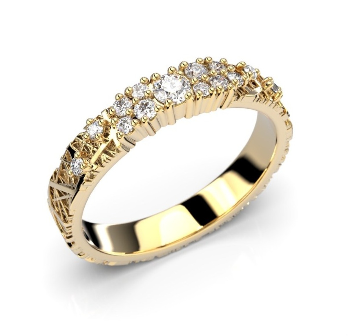 Festive Routa Tieva diamantring 664-015-KK är tillverkad i gult guld och dekorerad med ett mönster inspirerat av granit och briljantslipade diamanter 0,07+2x0,02+2x0,015+9x0,01 (Total. 0,23 ct).