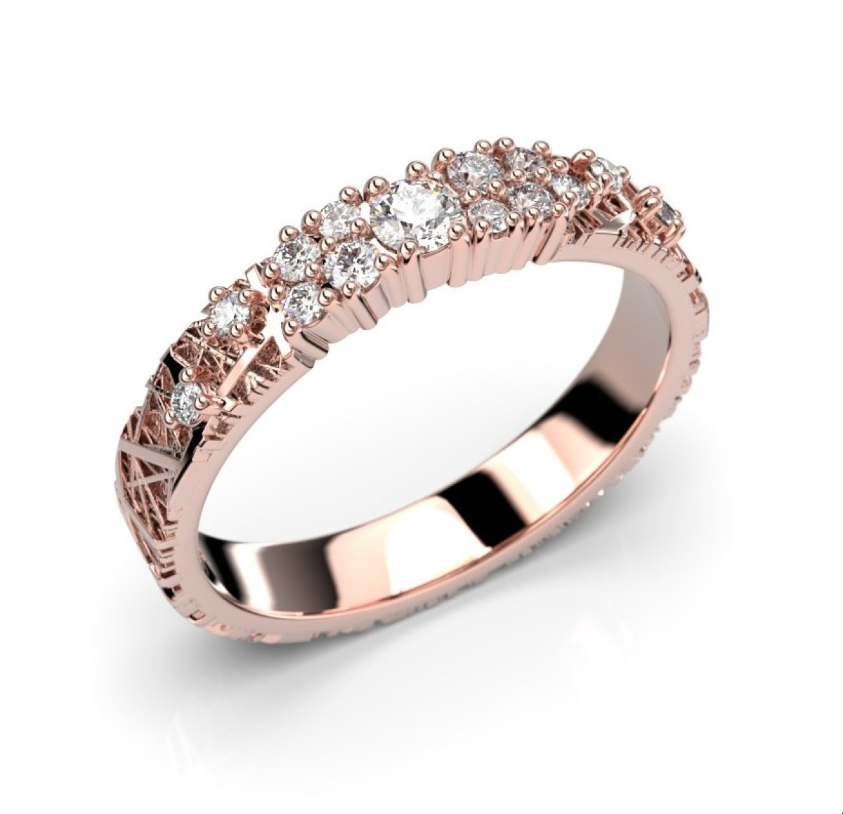 Festive Routa Tieva diamantring 665-023-PK är tillverkad i rose guld och dekorerad med ett mönster inspirerat av granit och briljantslipade diamanter 0,07+2x0,02+2x0,015+9x0,01 (Total. 0,23 ct).