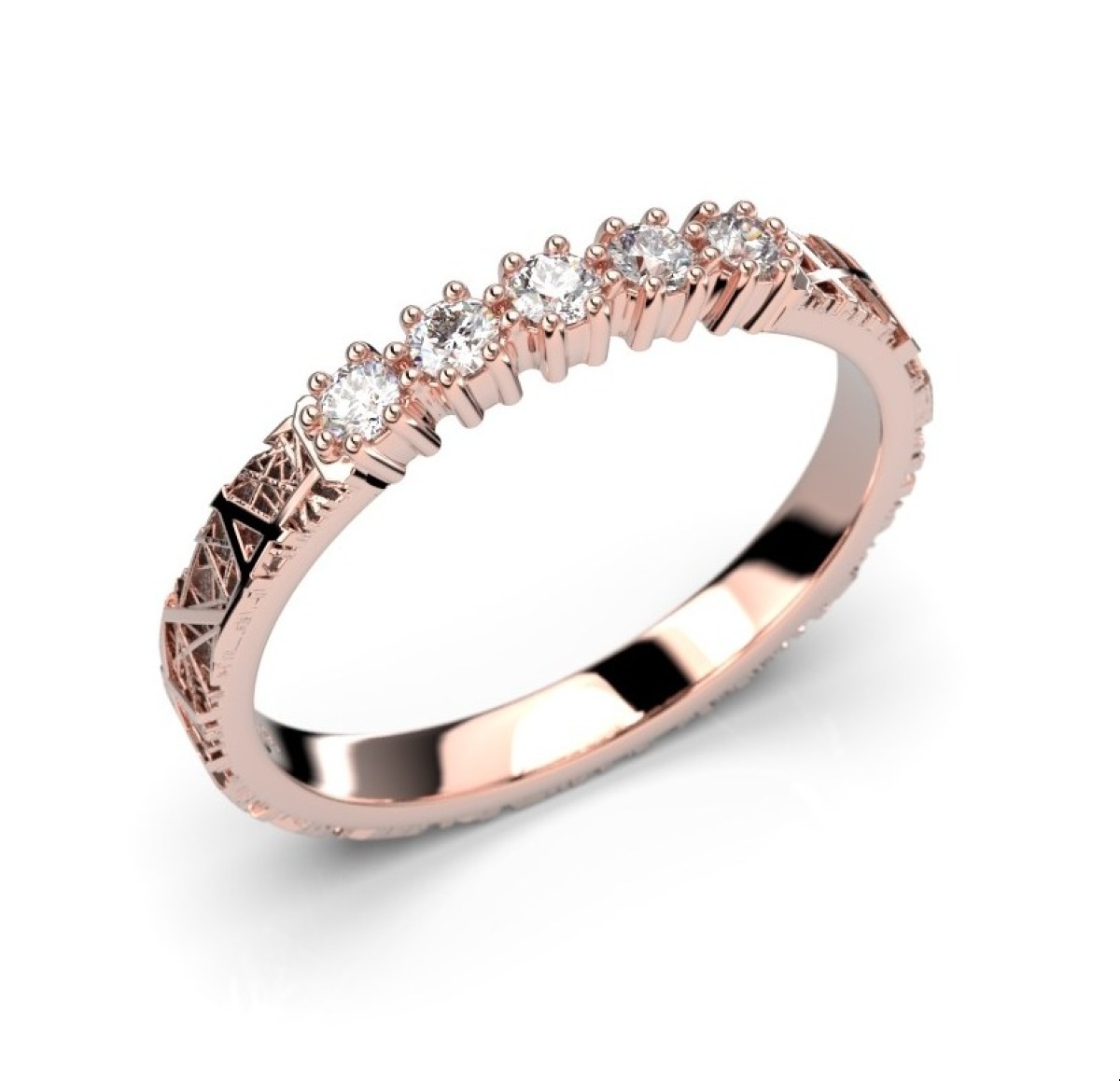 Festive Routa Tieva diamantring 664-015-PK är tillverkad i rose guld och dekorerad med ett mönster inspirerat av granit och briljantslipade diamanter 5x0,03 (0,15 ct).