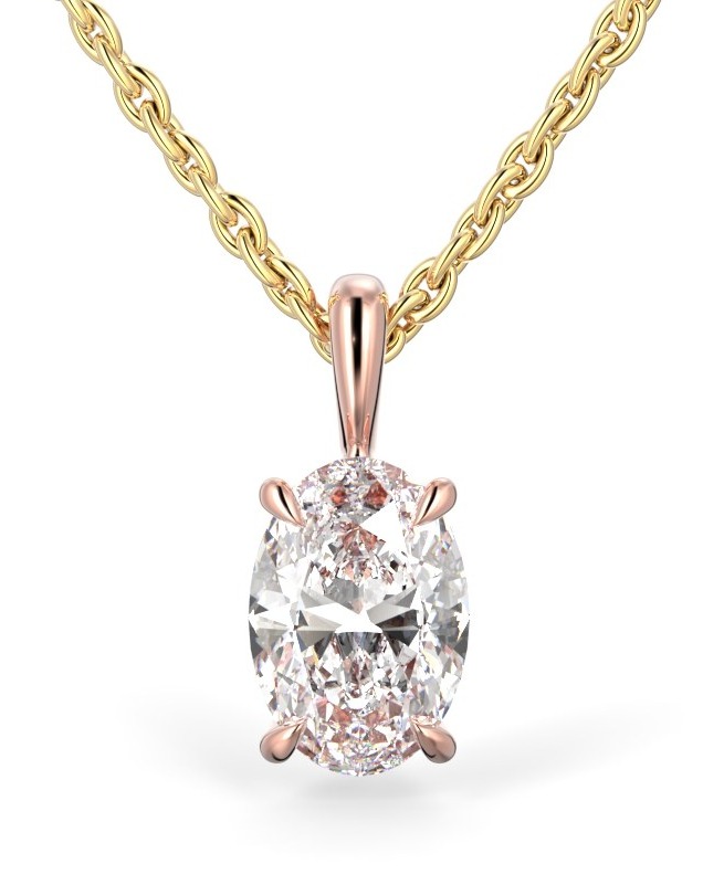 Festive Selena 1,00 ct diamanthänge 705-100-PK är infattad med en Wesselton SI1 naturdiamant, eller om du föredrar det, en VS1 labbodlat diamant på 1,00 ct. Den ovala diamanten är infattad med totalt fyra droppformade klor. Hängsmycket i roséguld är infattat i 14 eller 18 karats roséguld. Berlocken finns också i gult guld och vitt guld. Hängsmycket är 12,0 mm långt och 5,8 mm brett. Kedjan säljs separat.
