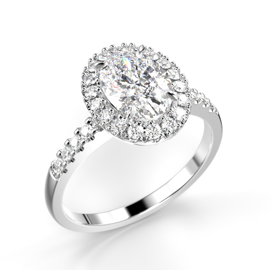 Den ovalformade Festive Selena Halo 1,26 ct diamantring är ett lyxigt och imponerande val, med en halofattning som framhäver mittstenens skönhet. En oval diamant gnistrar i mitten, inramad av 26 mindre briljantslipade diamanter - några av dem fortsätter vackert in i ringens kropp. Ringen är tillverkad i 14k vitguld och har totalt 27 diamanter: 1,00 ct + 26 x 0,01 ct för en totalvikt på 1,26 ct.
