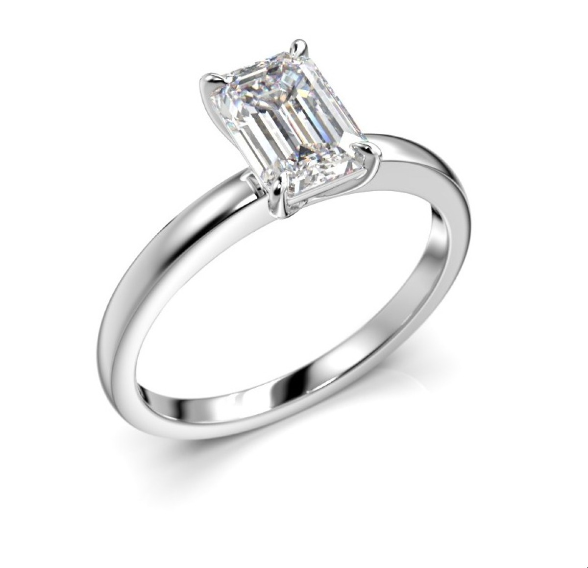 Diamantringar med smaragdslipade stenar är mycket stilren, och har en tydlig och klar slipning. Diamanten på denna Festive Emerald diamantring Serena 1,00 ct 684-100-VK är infattad i fyra klor, och skenan är i 14 eller 18 karat vittguld. Vitguldringens bredd vid infattning är 7,3 mm.