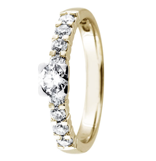 Festive Sophia Solitaire 351-067-kk är en vacker diamantring av gulguld med sidostenar. Största delen av ringstorleken tillverkas på beställning, och då är leveranstiden 10-20 arbetsdagar. Diamantringar som beställs från fabriken har endast bytesrätt. Graverade diamantringar har ingen retur- eller bytesrätt. Mer information om ringen hittar ni nedan på Mer information -fältet.