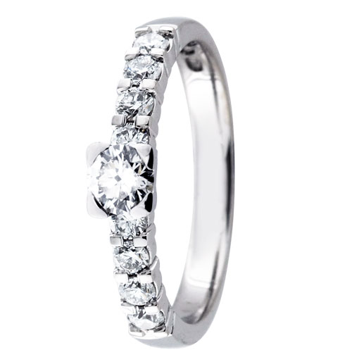 Festive Sophia Solitaire 351-067-vk är en vacker diamantring av vitguld med sidostenar. Största delen av ringstorleken tillverkas på beställning, och då är leveranstiden 10-20 arbetsdagar. Diamantringar som beställs från fabriken har endast bytesrätt. Graverade diamantringar har ingen retur- eller bytesrätt. Mer information om ringen hittar ni nedan på Mer information -fältet.