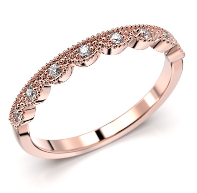 Festive Veera roseguld halvalliansdiamantring 696-008-PK är en vacker ring i sig själv, och passar också perfekt tillsammans med en slät eller en enstensring. Veera-diamantringen är infattad med åtta 0,01 ct Wesselton-diamanter. Skenan är 2,4 mm tjockt, ringens ena kant är slät och den andra är dekorerad med en spetskant. Ringen är i roseguld och ni kan välja om ni önskar ringen i 18 karat guld eller 14 karat.