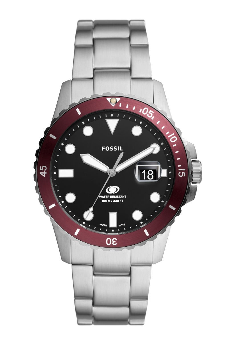 Fossil Fossil Blue silver stainless steel FS6013 är en fullblodig dykarklocka med många klassiska och snygga design detaljer. Den runda boett är 42 mm i diameter, och klockans urtavla är prydd med klassiska baton indexen. Omkring urtavlan sitter en vinrött bezel. Vattentätheten är upp till 100 m och klockan passar perfekt till vattensporter och segling. Designad av amerikanska märket Fossil, denna dykare har 2 års garanti och skickas hem i tillverkarens originalförpackning.