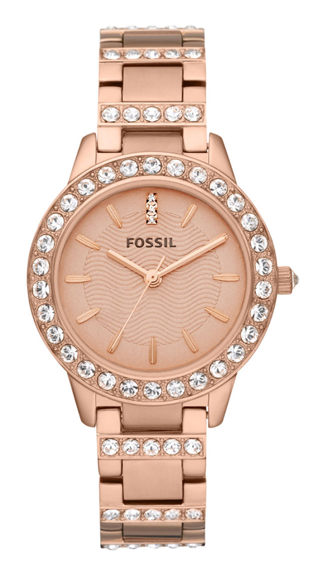 Fossil Jesse ES3020 är en vacker damklocka med roséguldfärgat rostfritt stål armband och gnistrande kristaller. Boettens bredd är 34 mm och armbandets bredd är 16 mm. Designad av amerikanska märket Fossil, denna damklocka har 2 års garanti och skickas hem i tillverkarens originalförpackning.