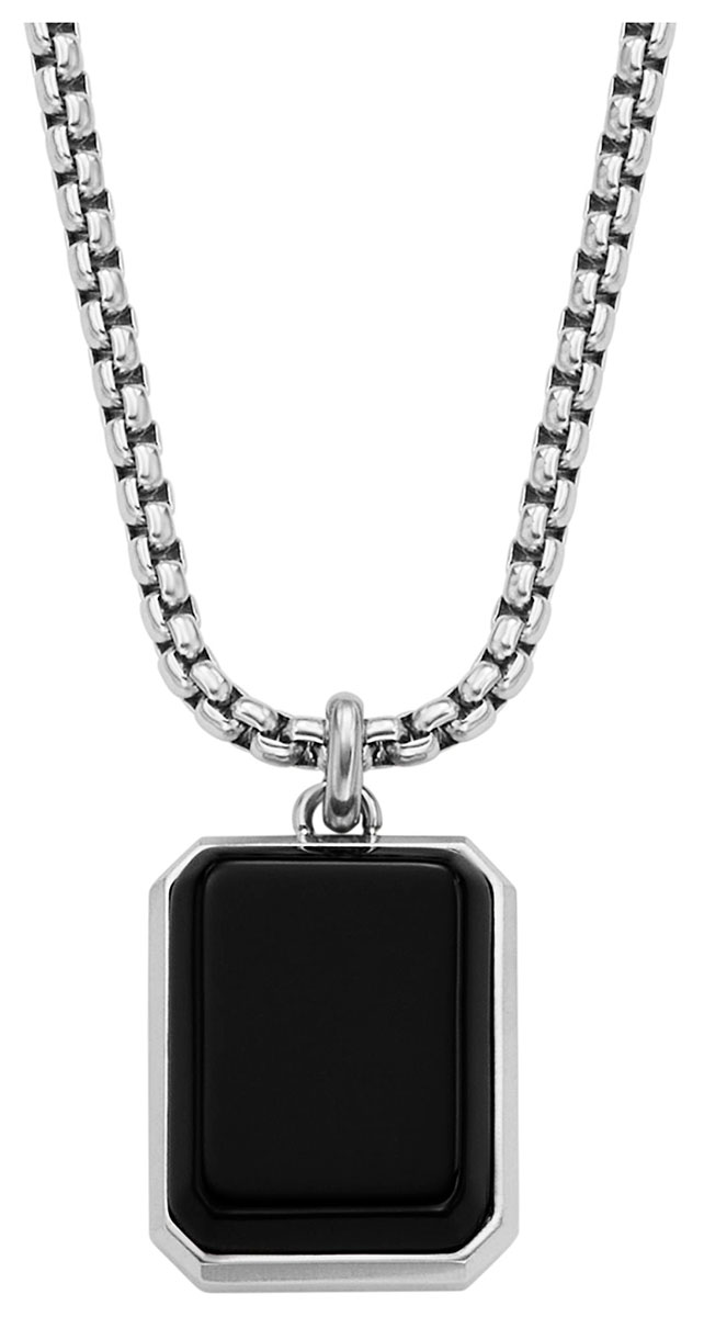 Fossil Jewelry JF04601040 ID tag halsband är tillverkat av silverfärgat rostfritt stål och hänget är utsmyckat med svart agat. Kedjans längd är justerbar från 508 till 563 mm och hängets storlek är 20 x 13 mm. Fossil smycken, från amerikanska Fossil, levereras i tillverkarens originalförpackning.
