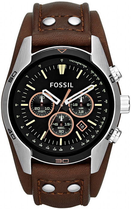 Fossil Coachman Kronograf CH2565 är en stilren kronografklocka med tre subdialer, tachymeter samt ett brunt armband. Den borstat silverfärgad boett har bredd är 45 mm och armbandets bredd är 22 mm. Viktiga funktioner: tidtagarur och kalender. Designad av amerikanska märket Fossil, denna kronografklocka har 2 års garanti och skickas hem i tillverkarens originalförpackning.