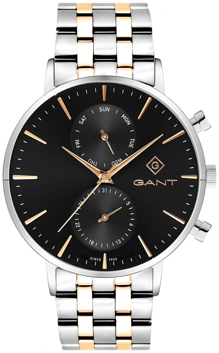 Tvåfärgat Gant Park Hill Day-Date G121015 armbandsur passar till både fest och vardag. Klockan är tillverkad helt i rostfritt stål och den har ett silverfärgat klockhus och ett matchande två-tonad armband. Boettens bredd är 43,5 mm och tjockleken är 10 mm. Klockan är vattentät till 50m/5atm (vi rekommenderar att inte simma med klockan) och den har två subdialer som visar både datum och veckodag. Gant klockorna har garanti upp till två år och de levereras i tillverkarens originalförpackning.