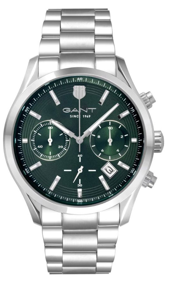 Kronografklockan Gant Prestige Chronograph P206004 är lämplig för att ta tid på sportprestationer såväl som vardagstid. Klockan drivs av ett förstklassigt japanskt Miyota 6S20 kvartsurverk. Boetten i rostfritt stål är 43 mm bred och 12 mm tjock, medan ett tåligt anti-rep safirglas skyddar den gröna urtavlan med subdial för tidtagningsfunktioner, en minutskala, en datum mellan klockan 4 och 5 och självlysande visare och index som lyser upp i skymningen. Stålarmbandets bredd vid fästpunkten är 20 mm. Gant Prestige Chronograph P206004 har en vattentäthetsklass på 100m/10atm, vilket gör den lämplig för badning och snorkling.