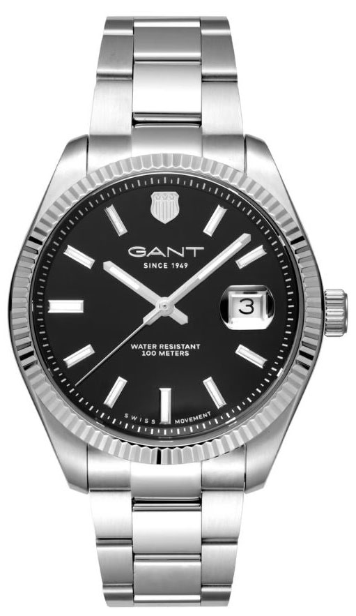 Gant Prestige P106001 har ett distinkt datum med förstoringsglas vid klockan 3, så att du kan se det aktuella datumet med en snabb blick. Klockan har en elegant, räfflad boettring och boetten mäter 40,5 mm i bredd och 11,5 mm i tjocklek. En repfri safirkristall skyddar den svarta urtavlan, som har ett datum och silverfärgade självlysande visare och index som gör det lätt att läsa av urtavlan i mörker. Bredden på det silverfärgade stålarmbandet vid fästpunkten är 20 mm. Klockan drivs av ett schweiziskt kvartsurverk av märket Ronda 515. Gant Prestige P106001 har en vattentäthet på 100m/10atm, vilket gör den lämplig för badning och snorkling.