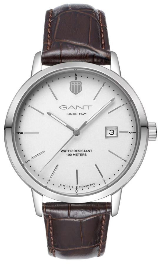 Gant Prestige P266001 armbandsur för män kombinerar ett modernt och slående utseende och form, perfekt för att bära som en kostymklocka. Klockhuset är tillverkat av rostfritt stål med en bredd på 42 mm och en tjocklek på 10 mm. Klockan drivs av ett schweiziskt Ronda 515 kvartsurverk. Ett tåligt safirglas skyddar den vita urtavlan med datum vid klockan 3 och silverfärgade självlysande visare som underlättar avläsningen i mörker. Den bruna armbanden är tillverkad av äkta läder med en bredd på 20 mm vid fästpunkten. Gant Prestige P266001 är vattentät till 100m/10atm, vilket gör den lämplig för badning och snorkling.