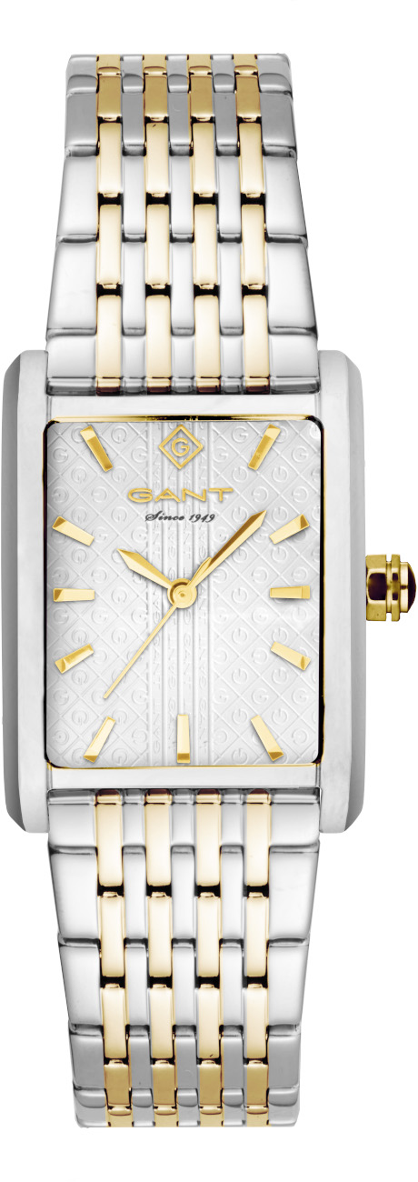 Gant Rhode Island G173008 är en graciös damklocka med silverfärgad boett i rostfritt stål. Den rektangulära boetten är 24 mm bred och endast 7 mm tjock. Denna fyrkantig klocka har ett tvåfärgat stålarmband med en bredd på 18 mm vid fästpunkten. Under mineralglaset skyddas en vacker ljusfärgad urtavla med guldfärgade visare och index. Urverket är ett högkvalitativt Seiko Y121 kvartsurverk. Gant G173005 är vattenresistent till 30m/3atm, vilket innebär att den är stänksäker. Gant-klockor har 2 års garanti och levereras i tillverkarens originalförpackning.