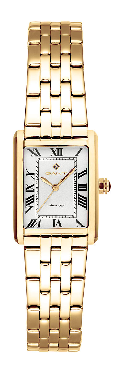 Gant Rhode Island Mini G195002 är en ännu mindre version av damarmbandsuret Rhode Island, med en guldfärgad boett och armband i rostfritt stål. Den rektangulära boetten är 20,5 mm bred och endast 7 mm tjock, med ett guldfärgat stålarmband som är 14 mm brett vid fästpunkten, och en vacker vit urtavla med svarta romerska siffror som index under mineralglaset. Urverket är ett högkvalitativt Seiko Y121 kvartsurverk. Gant Rhode Island Mini G195002 är vattenresistent till 30 m / 3 atm. Gant-klockor levereras med 2 års garanti och levereras i tillverkarens originalförpackning.
