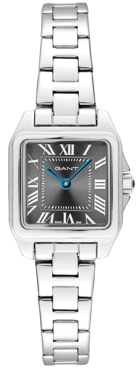 Gant Seneca G193012 damklocka har en sofistikerad fyrkantig boett och en mörkgrå urtavla med silverfärgade romerska index och blå minut- och timvisare. Klockan har ett Miyota GL22 kvartsurverk och boetten är 22 mm bred och endast 6 mm tjock. Bredden på stålarmbandet från fästpunkten är 12 mm, vilket gör klockan mycket bekväm att bära på handleden. Gant Seneca G193012 är vattentålig till 30 m / 3 atm, vilket betyder att den är stänkskyddad. Gant-klockor har två års garanti och levereras i tillverkarens originalkartong.