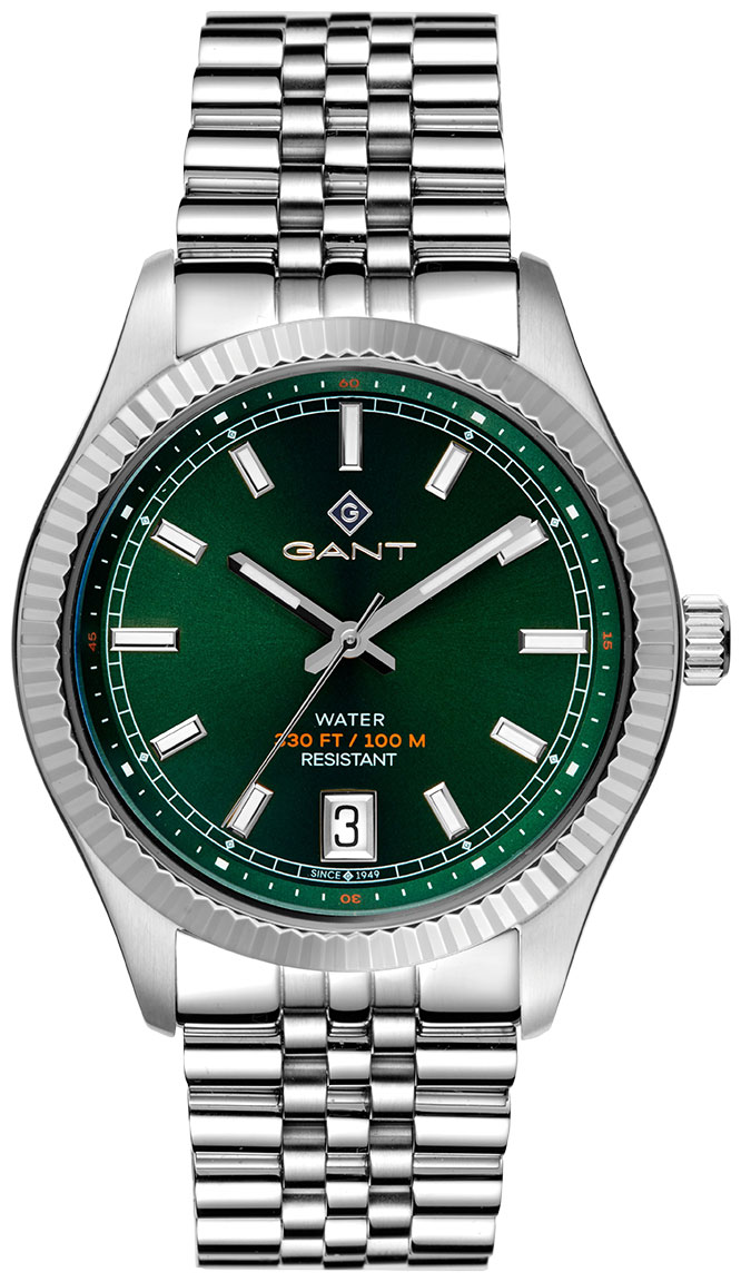 Gant Sussex 44 G166010 är en klassisk herrklocka helt i silvrigt rostfritt stål. Den grön urtavlan är rustad med tydliga vita baton indexen och en datumvisning, och räffling på ringen ger klockan en tidlös look som passar till varje tillfälle. Boetten är 43,5 mm i diameter och 11 mm i tjocklek. Alla Gant-klockor har 2 års garanti och skickas hem i tillverkarens originalförpackning.