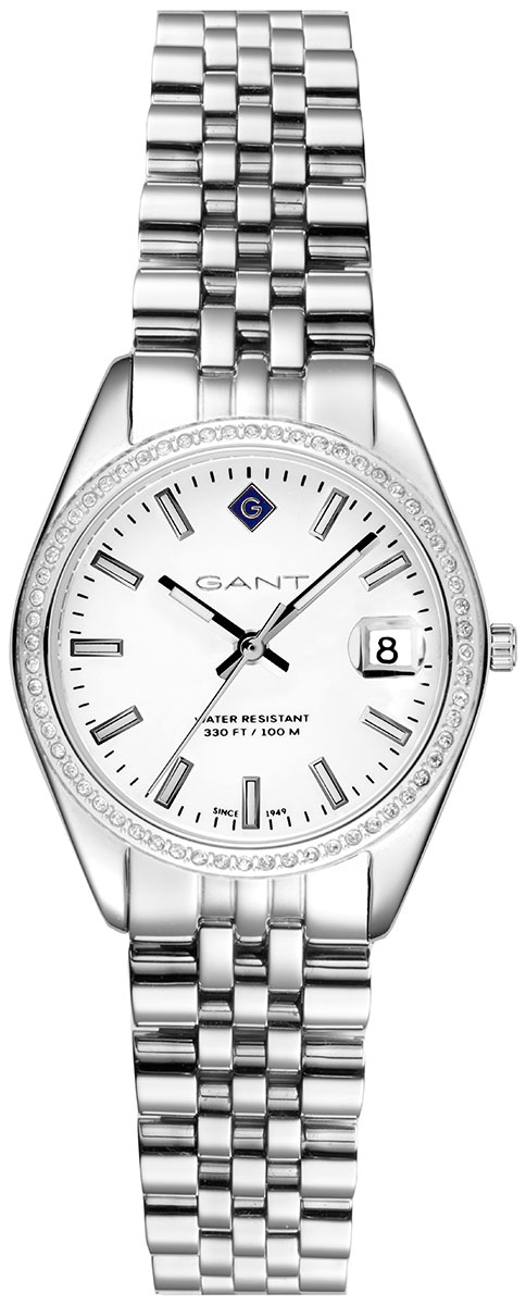 Gant Sussex Mini G181112 damklocka har en vacker silverfärgad kropp, från boetten till infattningen och stålarmbandet. Urtavlan har ett datumfönster med ett förstoringsglas vid klockan tre, vilket gör det ännu enklare att läsa datumet. Klockan har ett Miyota GN12 kvartsurverk, som skyddas av ett rostfritt stålboett. Boetten är 28 mm bred och 8 mm tjock. Klockan är vattentålig till 30 m / 3 atm, vilket betyder att den är stänkskyddad. Gant-klockor har två års garanti och levereras i tillverkarens originalkartong.