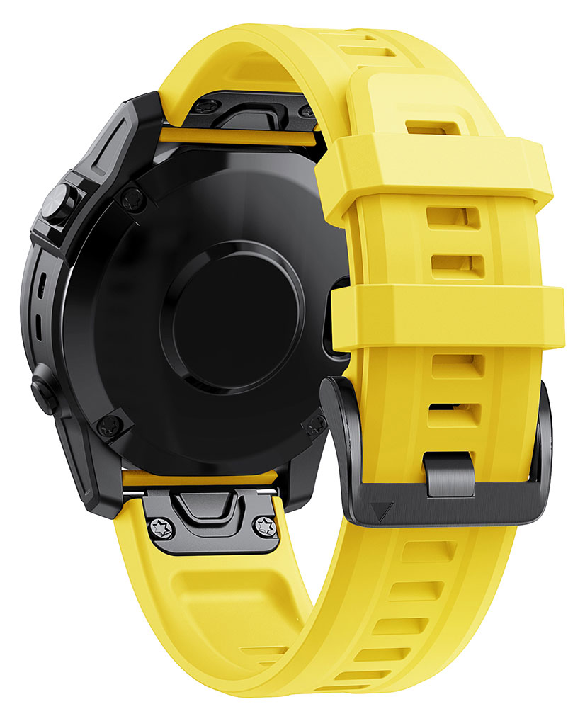 Garmin Fenix Classic silikonarmband gul med QuickFit 26 mm är ett högkvalitativt tillbehörsarmband för Garmin-klockor med 26 mm bred QuickFit-snabbfäste. Armbandsets snabbkoppling gör det enkelt att fästa och lossa armbandet utan verktyg. Klockarmbandet är tillverkat av silikon. Kompatibla modeller är bland annat Garmin Fenix 5X, Garmin Fenix 6X, Garmin Fenix 7X, Garmin Instinct 2X och Garmin Taxtic Delta. Armbandet har en traditionell spänneförslutning. Längden på armbandet är 200 mm, men observera att klockboetts längd är ca 40-50 mm, så armbandet passar även mycket tjocka handleder. Längden på armbandet kan enkelt justeras med spännet. Armbandet är garanterat i 1 år. Garantin täcker material- och tillverkningsfel. Klockarmbandet är inte tillverkad av Garmin, det är ett tillbehörsarmband.