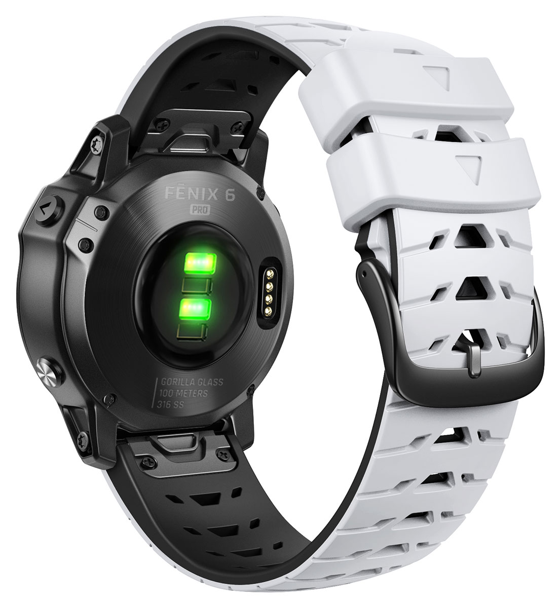 Garmin Fenix Sport silikonband vit-svart med QuickFit 22 mm är ett högkvalitativt klockarmband för Garmin-klockor med 22 mm bred QuickFit-fäste. Snabblåsningen av armbandet gör det enkelt att fästa och lossa armbandet utan verktyg. Klockarmbandet är tillverkat av silikon. Utsidan av armbandet är vit och insidan är svart. Kompatibla modeller är Garmin Fenix 5, Garmin Fenix 6, Garmin Fenix 7, Garmin MARQ, Garmin Instinct, Garmin Instinct 2 och Garmin Forerunner 965. Armbandet har ett traditionellt spänne. Längden på armbandet är 200 mm, men observera att klockboetts längd är cirka 40-50 mm, så armbandet passar även mycket tjocka handleder. Längden på armbandet kan enkelt justeras med spännet. Armbandet är garanterat i 1 år. Garantin täcker material- och tillverkningsfel. Klockarmbandet är inte tillverkad av Garmin, det är ett tillbehörsarmband.