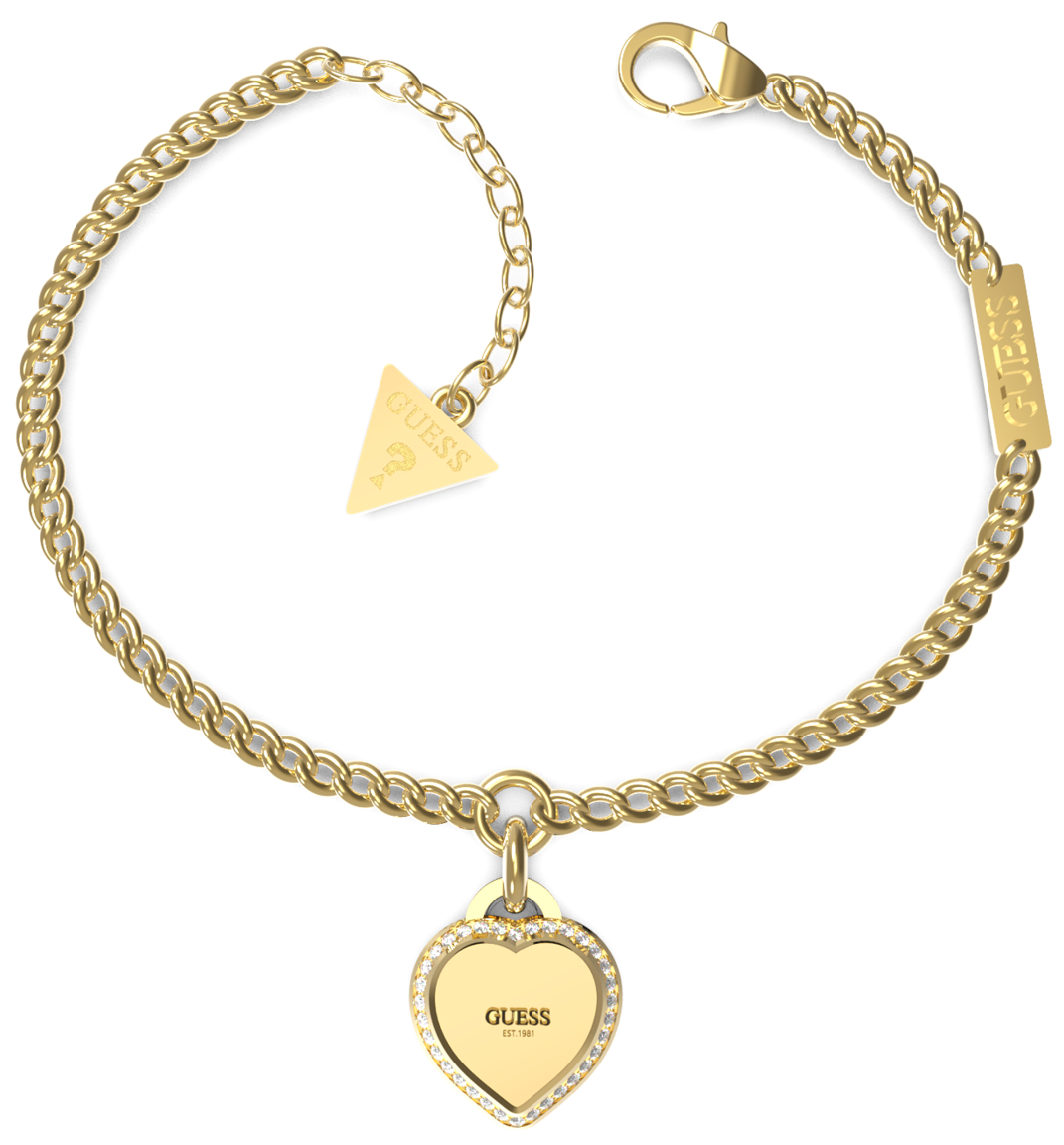De lyxiga GUESS-smyckena har en avslappnad look och är lätta att bära vid alla tillfällen. Det guldfärgade Guess JUBB01422JWYGS hjärtarmbandet är prydd med ett hjärta som är infattad med syntetiska zirkoner runt kanterna. Hänget mäter 13 mm och kedjan är justerbar från 15 till 19 cm. Guess-smyckena levereras i tillverkarens originalförpackning.