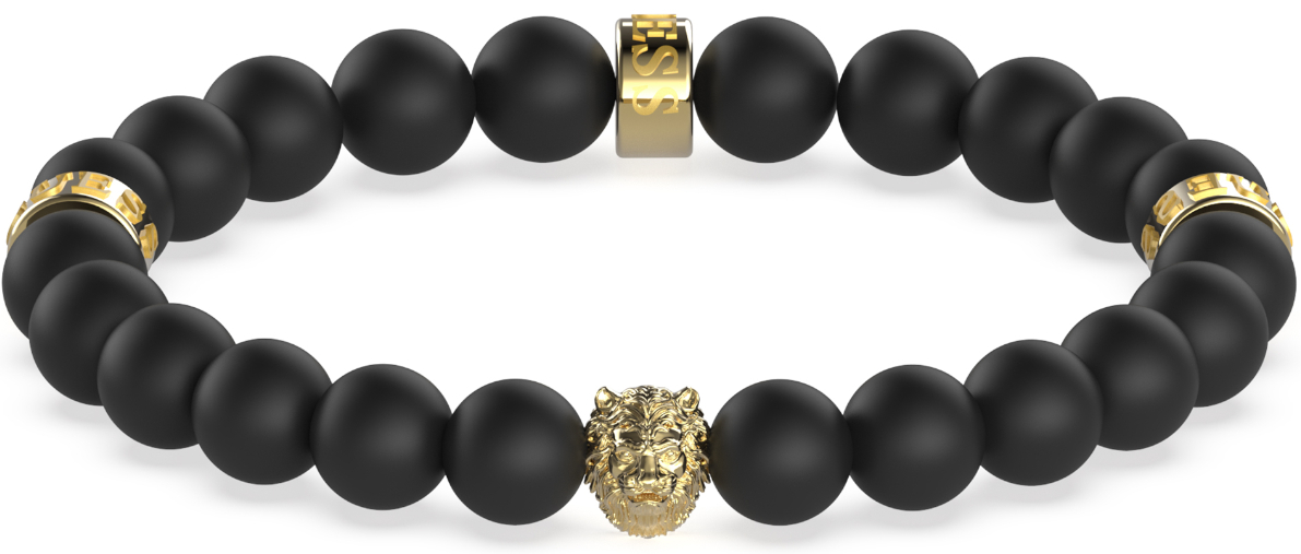 Det guldfärgade Guess Hero Lion head JUMB01303JWYGT/U-armbandet är tillverkat av svarta lavastenar och pryds av ett hänge med en lejontass. Hänget mäter 1,2 cm och kedjan är 20,5 cm lång. Guess-smyckena levereras i tillverkarens originalförpackning.