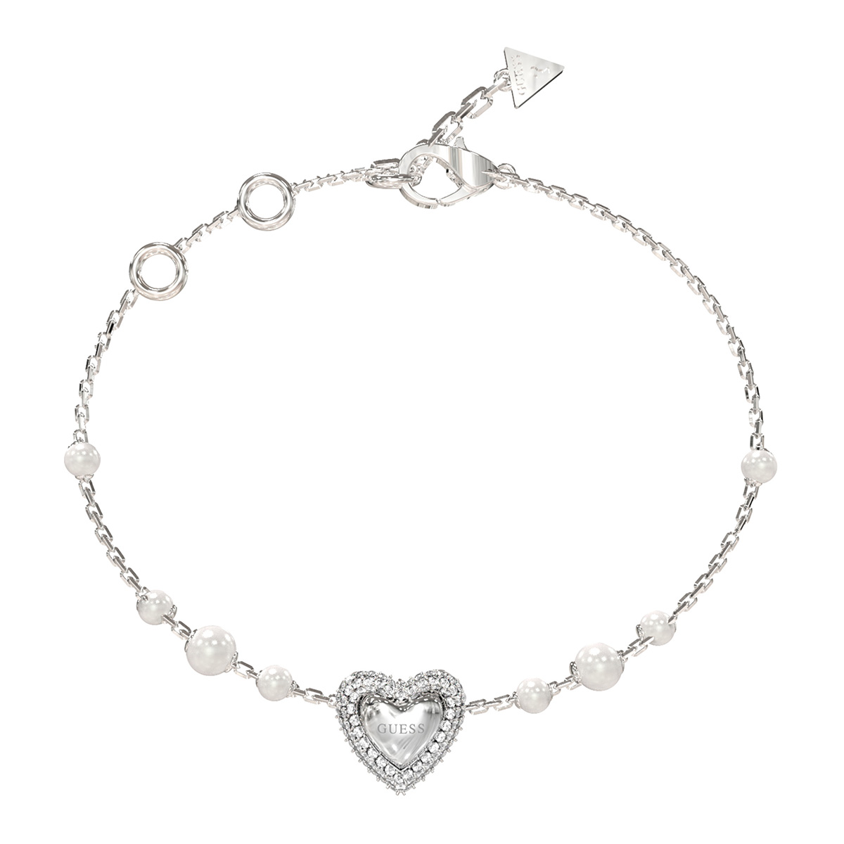 GUESS Beloved JUBB06009JWRHS armband är tillverkat av glänsande rostfritt stål, med en kedja infattad med ljusa pärlor och en stor, varm hjärtberlock. Kanterna på hjärtberlocken är fyllda med klara kristaller, vilket ger smycket extra glitter och glamour. Armbandet har ett lättöppnat och stängt papegojspänne. Kedjelängd 14,6 - 18,4 cm.