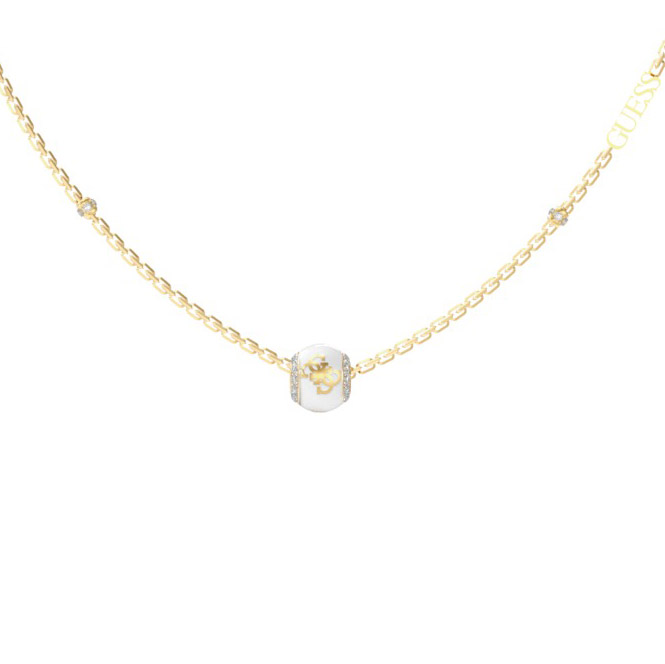 Tillbehör med monogram har alltid varit en lyxig accessoar för kvinnor. Guess 4G monogramm-mönstrade JUBN02281JWYGWHT/U halsband är prydd med ett vitemaljerat hänge, och den guldfärgade kedjan är justerbar från 40-45 cm i längd. Guess-smyckena levereras i tillverkarens originalförpackning.