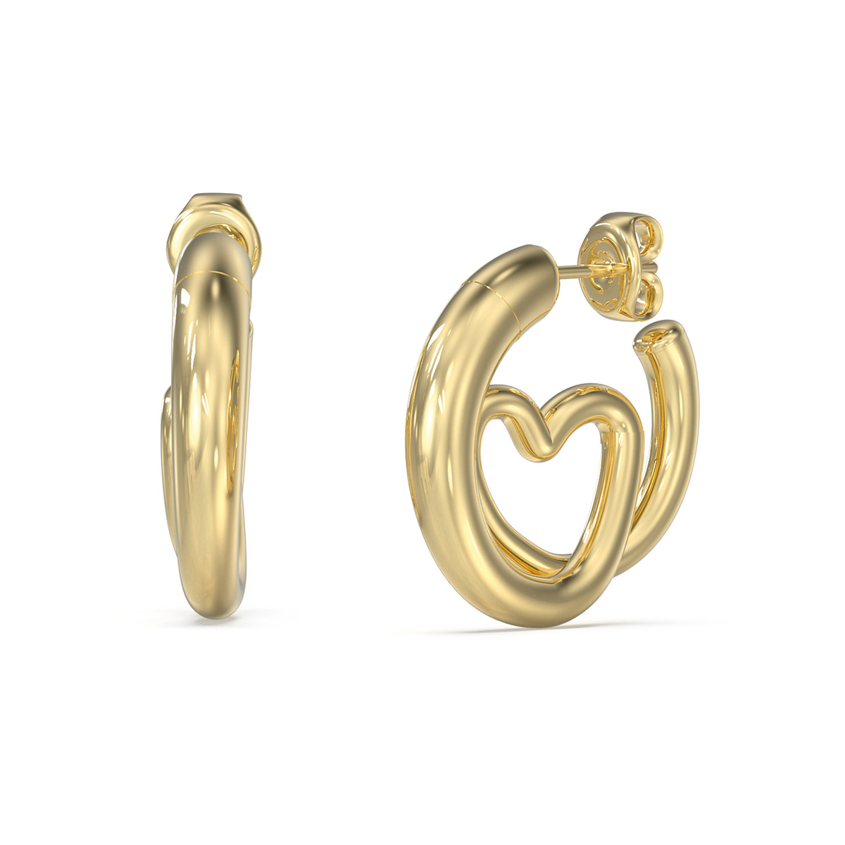 GUESS ICONIQUE örhängen charmar med sin moderna design. Tillverkade av guldfärgat rostfritt stål, 14 mm örhängena bildar ett stiliserat hjärtmönster som sticker ut med sina mjuka linjer. Stiftfästning garanterar säker och bekväm användning.