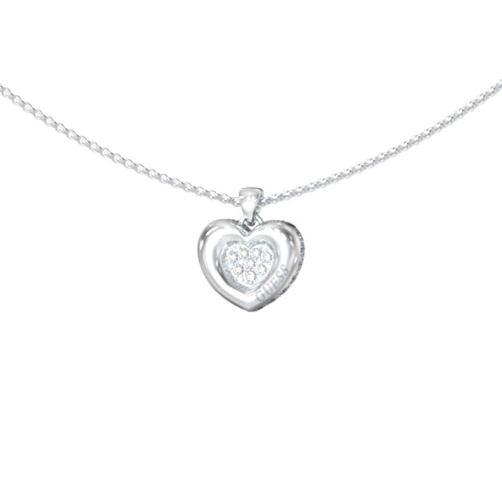 GUESS L.O.V.E. -halsband är ett delikat och romantiskt smycke för vardagslivet eller som present. Hjärthänget av silverfärgat rostfritt stål glittrar av en kristallsten. Den justerbara längden på 40,7–45,7 cm och papegojlåset garanterar en bra passform och komfort.