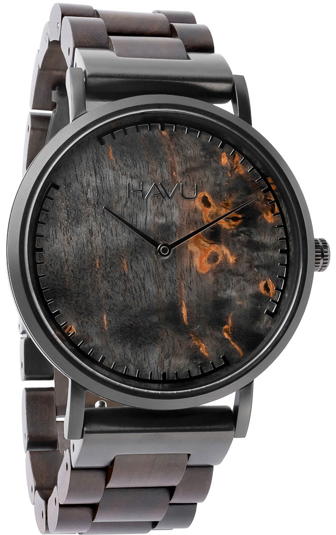 Havu Loimu är ett unikt unisex armbandsur tillverkat av slitstark ebenholts. Även klockans baksida är tillverkad av trä som känns mjukt mot handleden. Urtavlan skyddas av reptåligt safirglas och är 40 mm bred och 8 mm tjock. Havu Loimu drivs av ett japanskt Miyota GL22 kvartsurverk med hög precision. De första delarna av armbandet är av metall, så klockan kommer att tåla vardaglig användning. Armbandets bredd från fästpunkten är 20 mm. Klockan är vattenresistent till 30m/3atm, vilket gör den stänksäker.