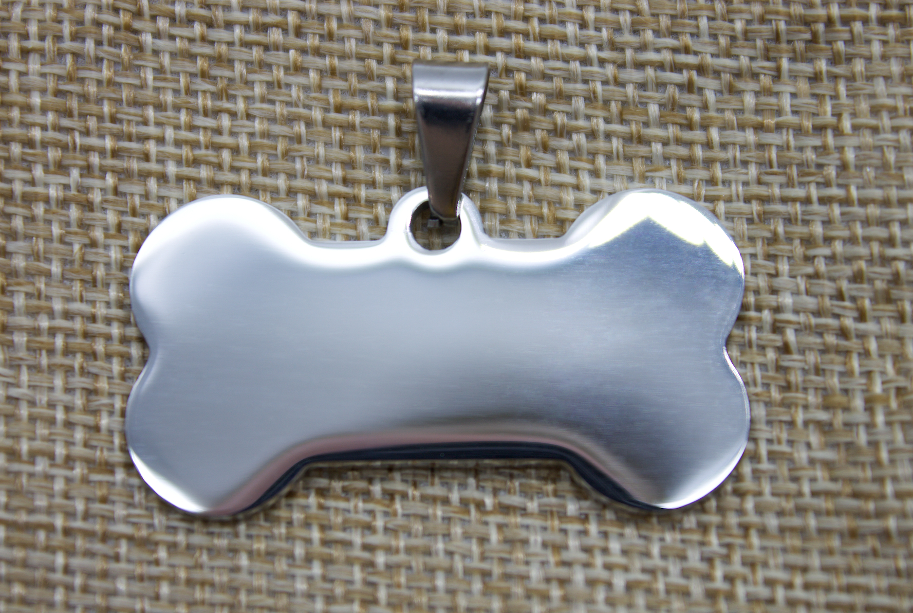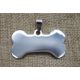 Vacker polerad benformad bricka i rostfritt stål. På denna namnbrickan graveras hundens namn på framsidan och telefonnummer och adress på baksidan.