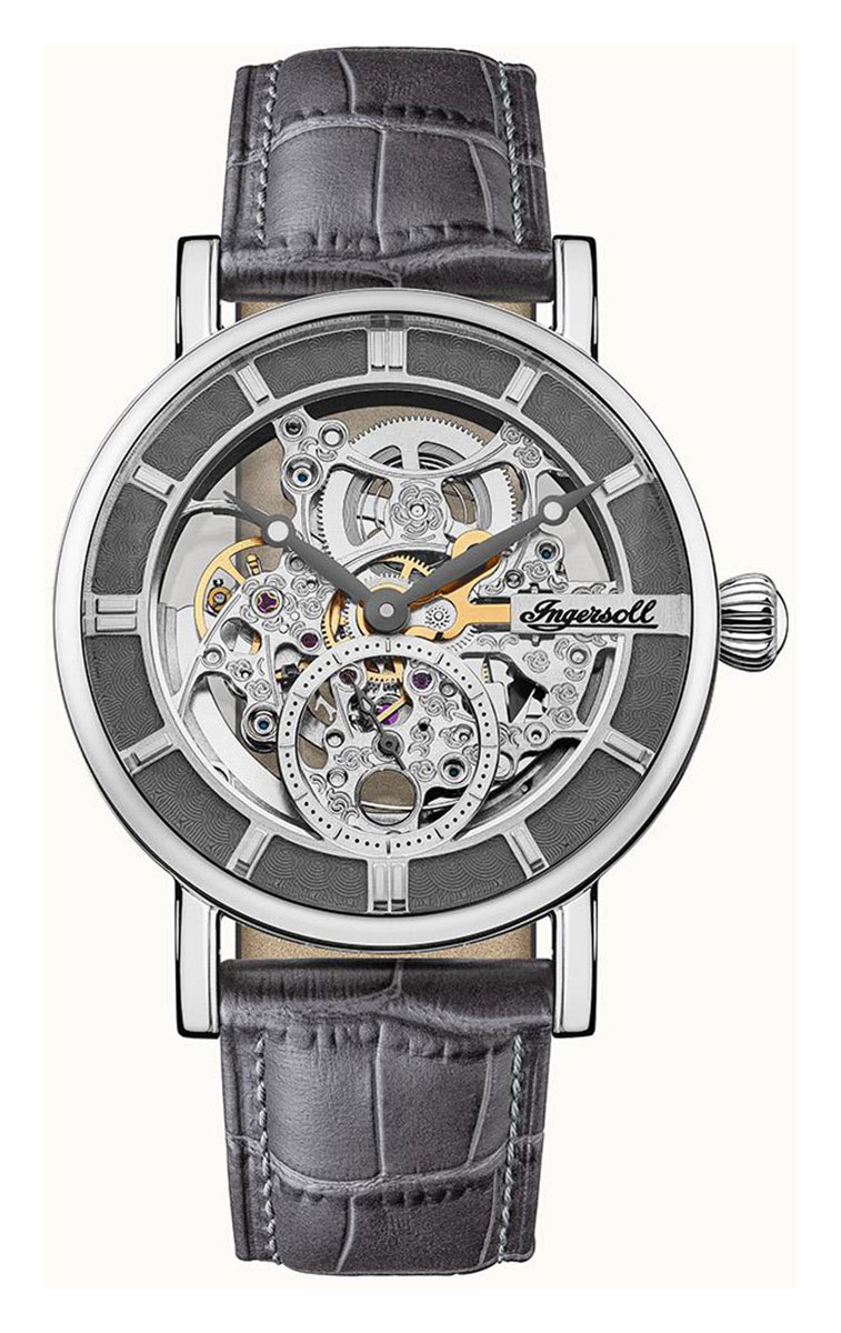 ‌ Ingersoll The Herald Automatic I00402B skeletonklocka har en klassisk färg schema som kombinerar ett grått krokodilmönstrad armband med ett silvrigt hölje. Den öppen Bullseye urtavlan visar klockans automatiskt urverk. Ingersoll klockor har 2 års garanti.