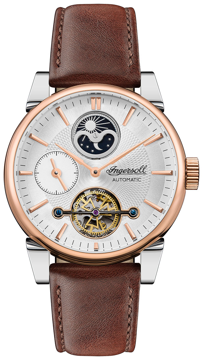 ‌ Ingersoll The Swing Automatic I07503 är en vacker open-heart herrklocka i retro stil. Denna herrklocka har en rund boett i roseguldfärgat stål som är matchad med ett brun läderrem. Den öppen urtavla har tydliga indexmarkörer och grain d'orge circulair guilloche. Ingersoll klockor har 2 års garanti.